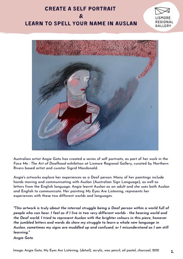Resources developed by Lismore Regional Gallery include Learn Auslan Alphabet Video; Face Me Angie Goto Activity Sheet; Auslan Self Portrait Activity with Sigrid Macdonald (with closed captions and voice-over)