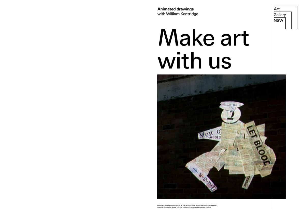 Resources from I am not me, the horse is not mine from the Art Gallery of NSW include a printable art activity - Make a Flip-book animation (all ages), a PDF Learning Resource for highschool students, including a video conversation between South African artist William Kentridge and Art Gallery of NSW director Dr Michael Brand, discussion questions, and artwork in focus, and Kinder - Year 6 activites and discussion points.
