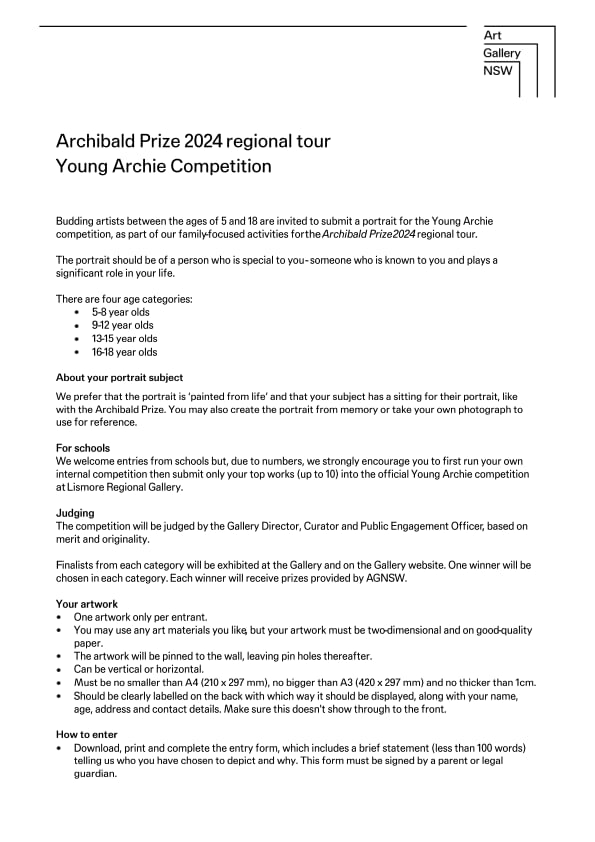 Budding artists between the ages of 5 and 18 are invited to submit a portrait for the Young Archie competition.The portrait must be of a person special to you – someone who knows you and plays a significant role in your life. While it's preferred the portrait is ‘painted from life’ as with the main Archibald Prize, you may also create the portrait from memory or a photograph.