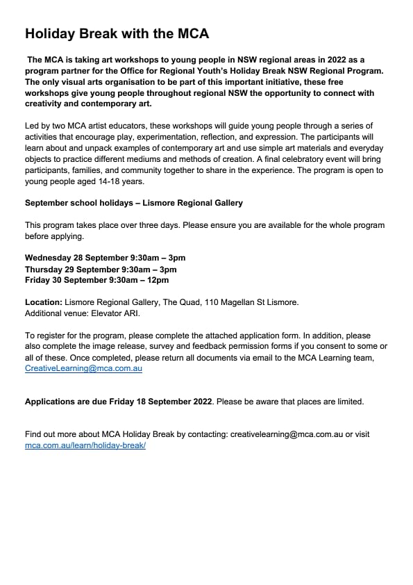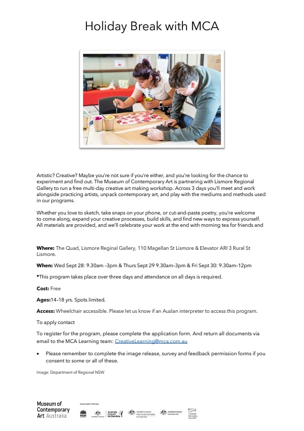 The MCA (Sydney) is partnering with Lismore Regional Gallery to run a free multi-day creative art making workshop at Elevator ARI Gallery and The Quad in Lismore CBD. Across 3 days from Wed 28 Sept, Thurs 29 Sept to Fri 30 Sept 2022, participants meet and work alongside practicing artists, unpack contemporary art, and play with the mediums and methods used in our programs.