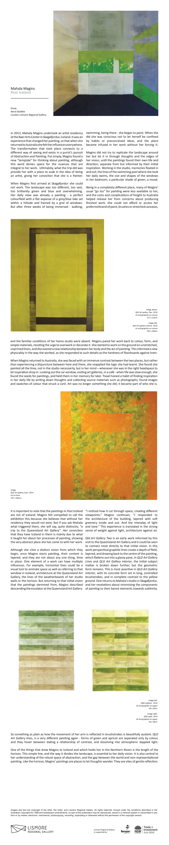 Mahala Magins undertook a residency in Iceland at the Baer Arts Center in Skagafjordur in 2013. The experience changed her practice as she tried to capture something of the essence of that place, without being seduced into illusionistic representations of it.