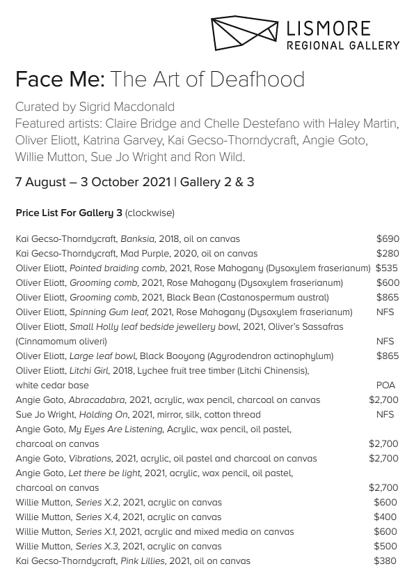 Face Me: The Art of Deafhood is an intentional bringing together of works by d/Deaf and Hard of Hearing artists, both local and national. Showcasing the work and stories of Deaf people of Australia, in a visual and tactile way, the exhibition reflects the very nature of the rich language and culture of the Deaf community.