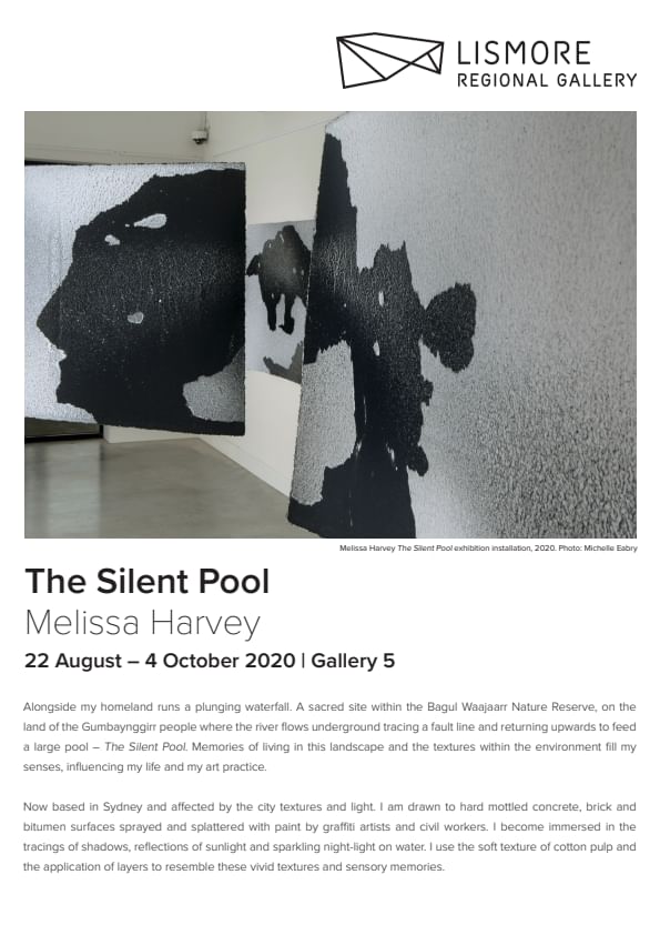 Alongside my homeland runs a plunging waterfall. A sacred site within the Bagul Waajaarr Nature Reserve, on the land of the Gumbaynggirr people where the river flows underground tracing a fault line and returning upwards to feed a large pool – The Silent Pool. Memories of living in this landscape and the textures within the environment fill my senses, influencing my life and my art practice.
